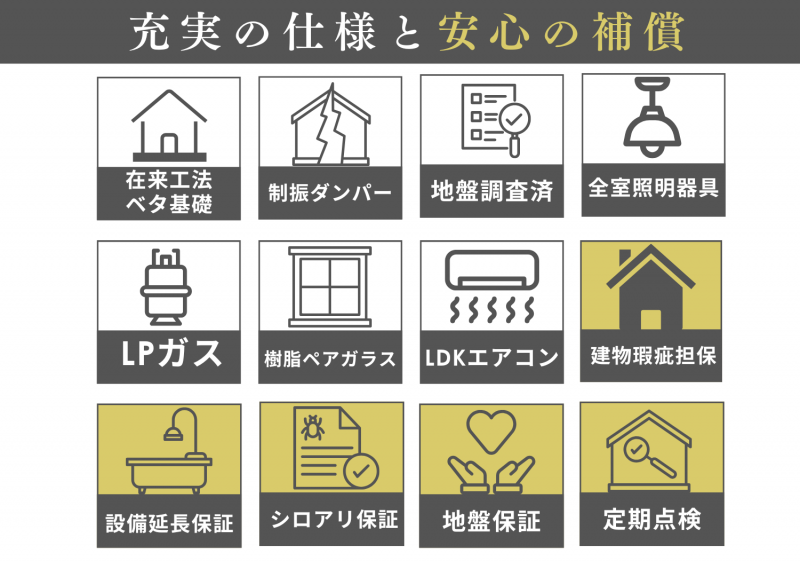 | 設備 | 温水洗浄便座、トイレ2ヶ所、追焚機能、浴室乾燥機、システムキッチン、浄水器、ウォークインクローゼット、床下収納、洗髪洗面化粧台、照明器具、電気、上水道、下水道、側溝、複層ガラス、エアコン、モニタ付インターホン、ディンプルキー、庭、駐車場3台分 | ||